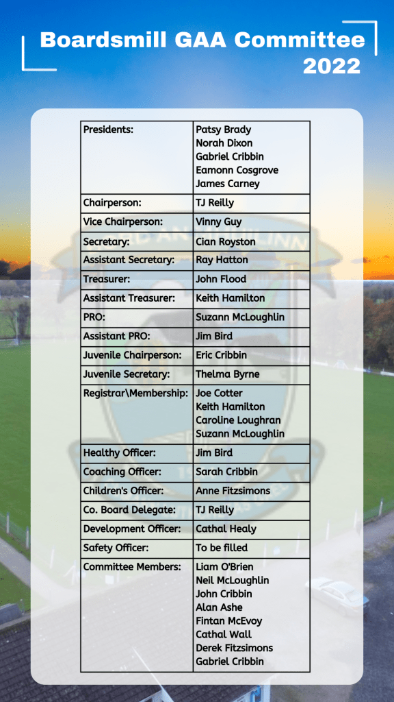 On Saturday 19th February 2022, Boardsmill GAA held their AGM in the local hall. First time we’ve been able to hold our AGM in person in 2 years. The following Committee were elected on the night:
