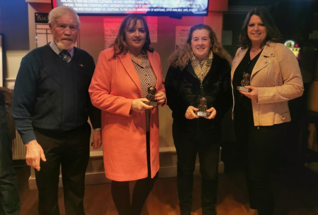 Chairperson TJ Reilly presents the Ladies Team Trophies to Deirdre Gibbons, Christine Fagan and Caroline Loughran all Boardsmill GAA