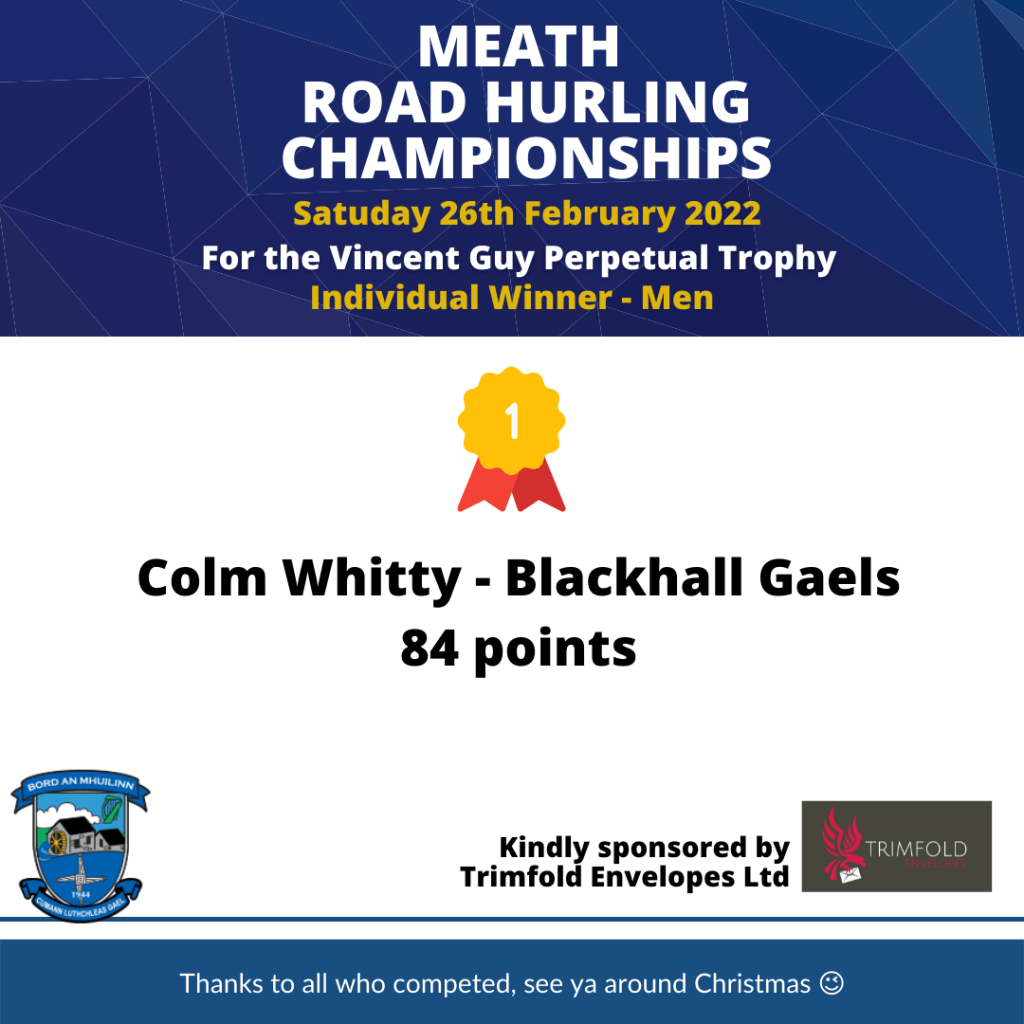“It’s absolutely fantastic to be able to host the Meath Road Hurling Championships again, a sign of hopefully getting back to some sort of normality after the Covid. The Committee would like to thank our sponsors of the event, Trimfold Envelopes Ltd for their generosity again this year, DC Distributors for the donation of sweets and crisps, Cara Quill for the donation of water, Fitzsimons Coaches for providing shuttle buses to and from the Hall, the ladies in the Hall giving out soup and bread, the residents on the road for accommodating the event, all the competitors for coming out and playing in such a windy day and all those who offered donations towards the event. All going well we’ll be back hosting the event around Christmas time”.