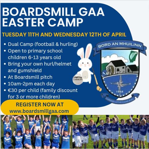 Boardsmill GAA are delighted to announce that we are launching our very first Easter Camp. REGISTER NOW – below!