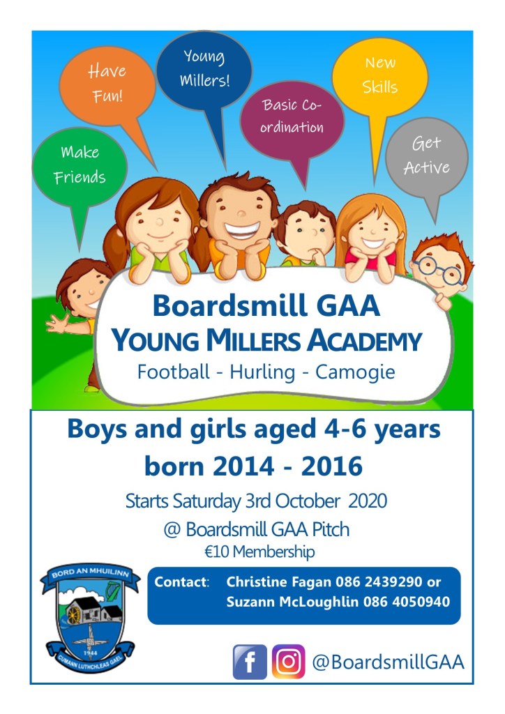 The Young Millers Academy is all about fun and enjoyment for the children and provides them with an opportunity to make friends and get used to playing and sharing with other children. They will learn the basic motor skills of Gaelic games and will participate in small sided matches.